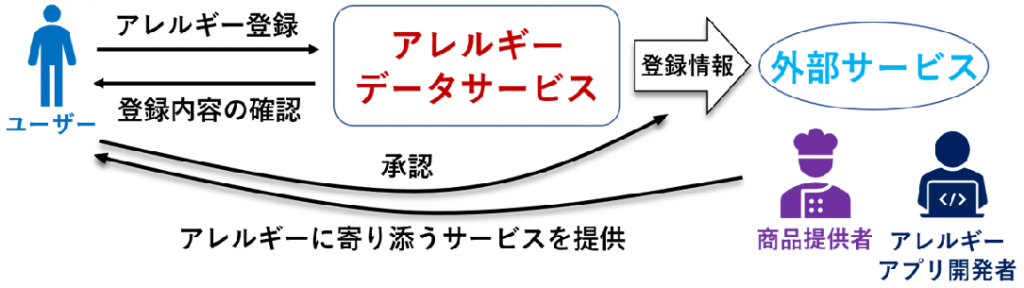 そこで私は、ユーザーが登録したアレルギー情報を一元的に管理し、ユーザーの了承のもとでそれらを外部と共有する「アレルギーデータサービス」を提案します。